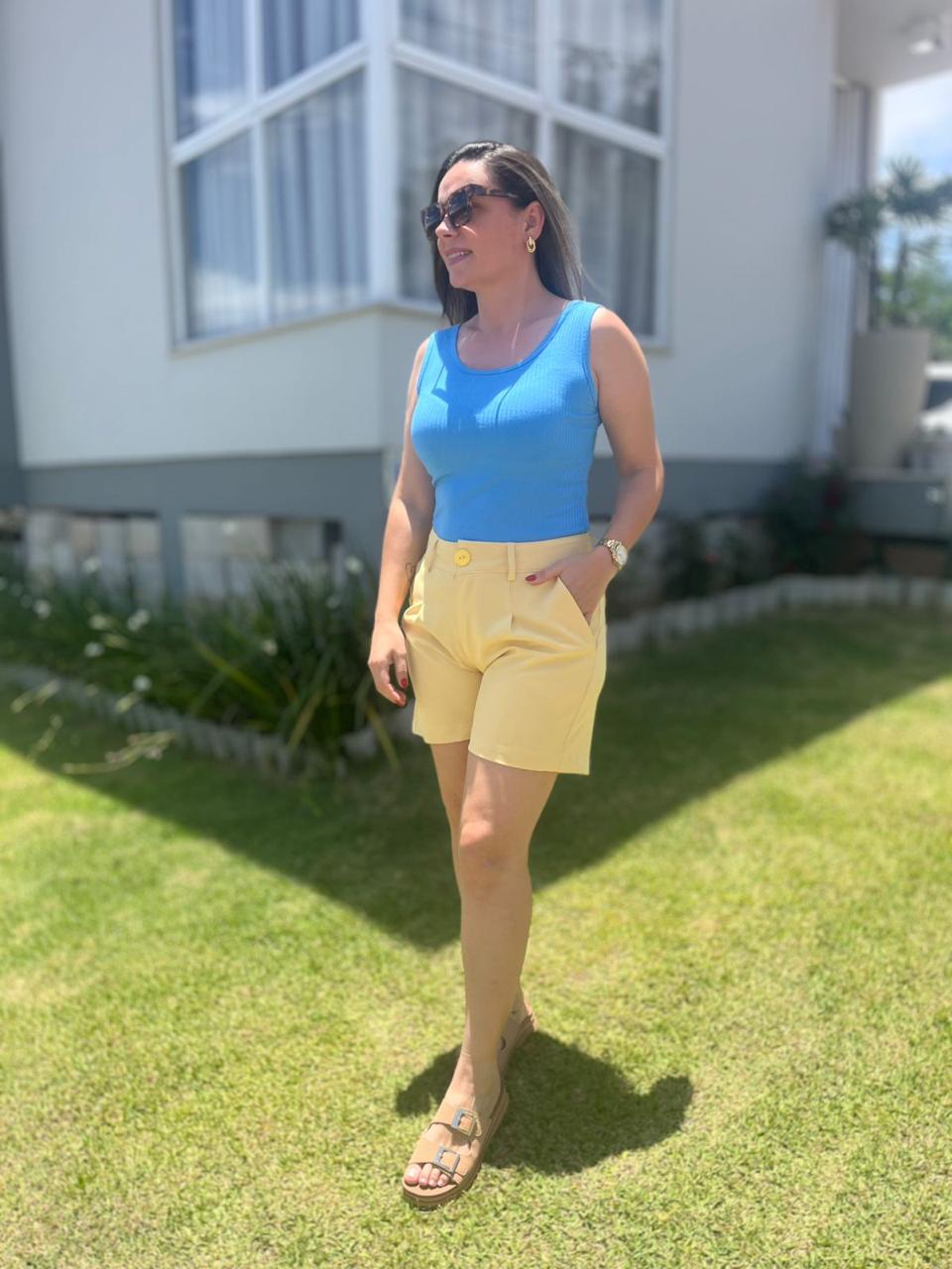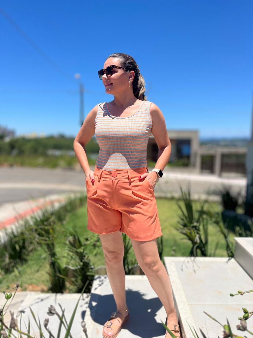 A bermuda de alfaiataria com pregas é uma peça versátil e elegante, caracterizada por cintura alta, modelagem estruturada solta), bolsos funcionais (faca e traseiro) e passantes para cinto. As pregas frontais adicionam volume sofisticado, valorizando a silhueta.
