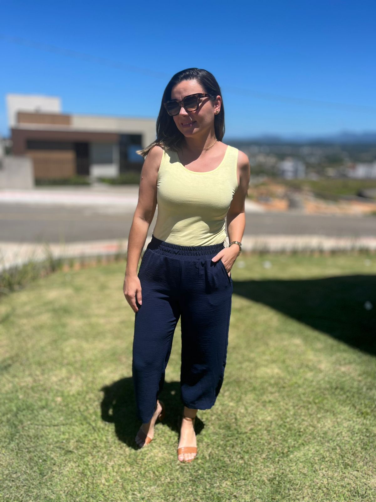 A calça pantacurt é uma peça versátil e elegante, caracterizada pelo comprimento midi (entre o joelho e a canela) e pernas amplas. Confeccionada em tecido crepe, oferece caimento fluido, leveza e conforto, ideal para climas quentes. Possui cintura alta, cós com elástico, proporcionando sofisticação a looks casuais.