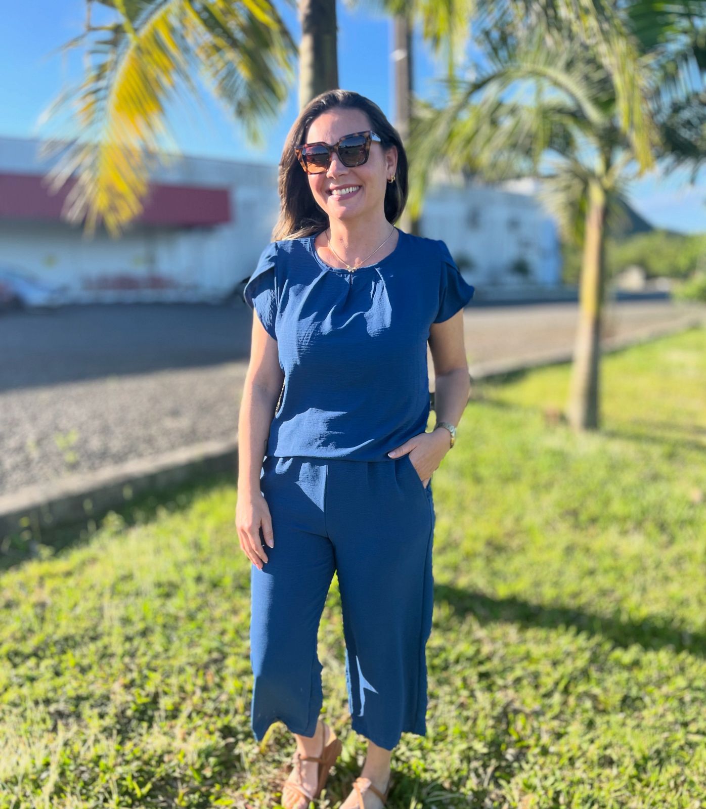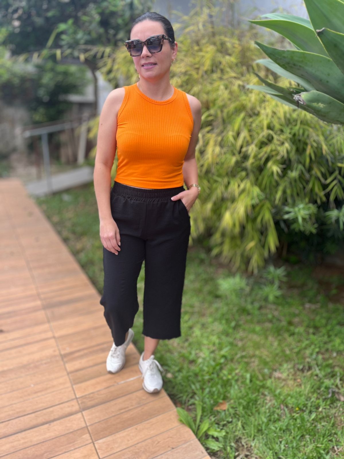 - Modelagem: Pantacourt (pantalona curta), solta no corpo com cintura alta.