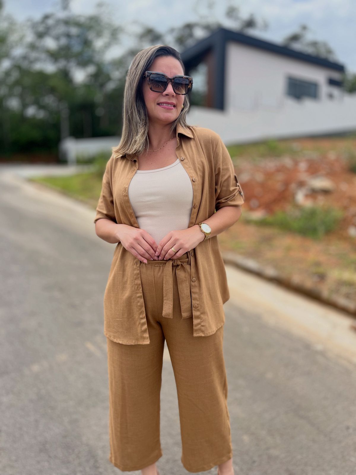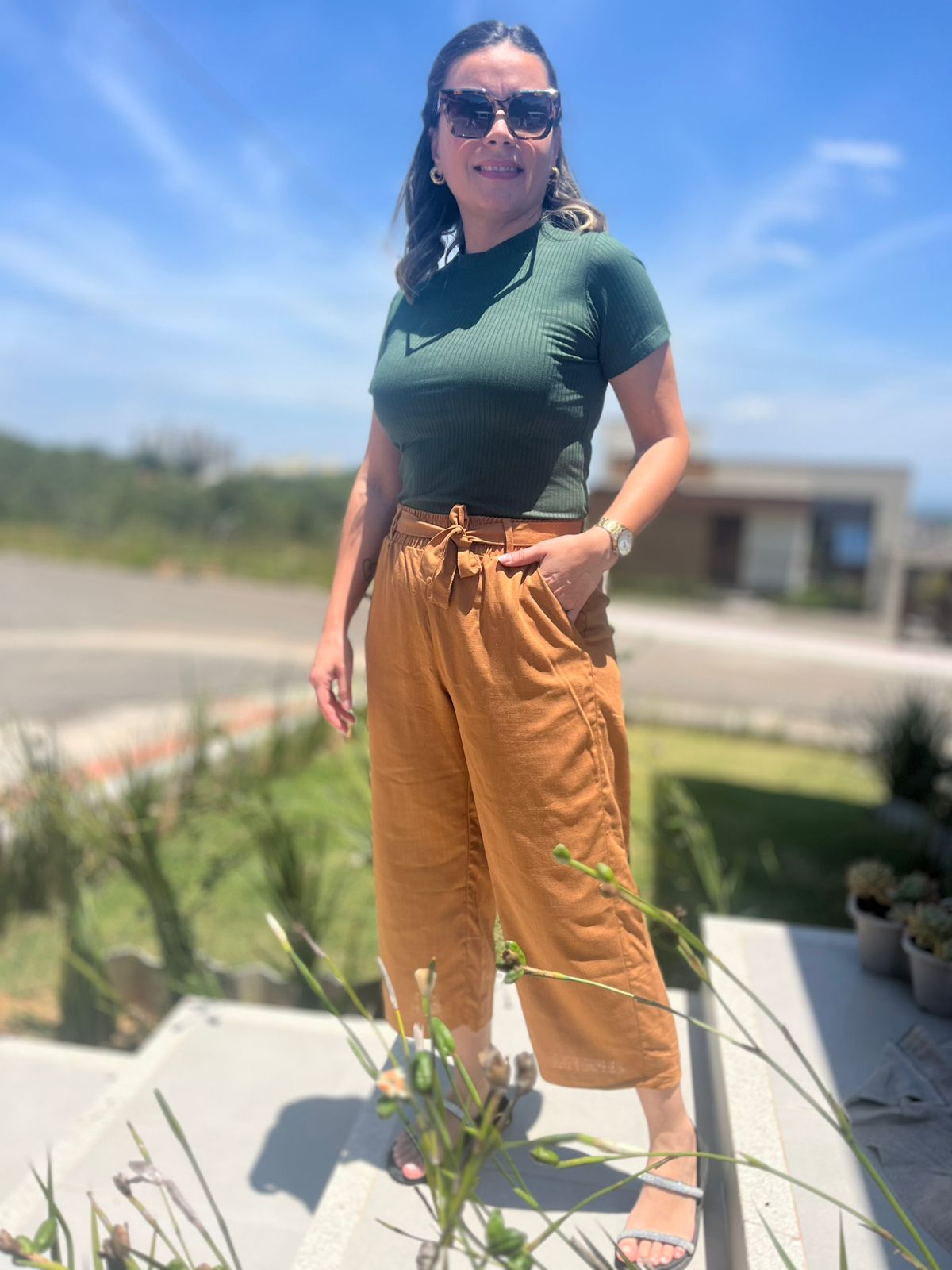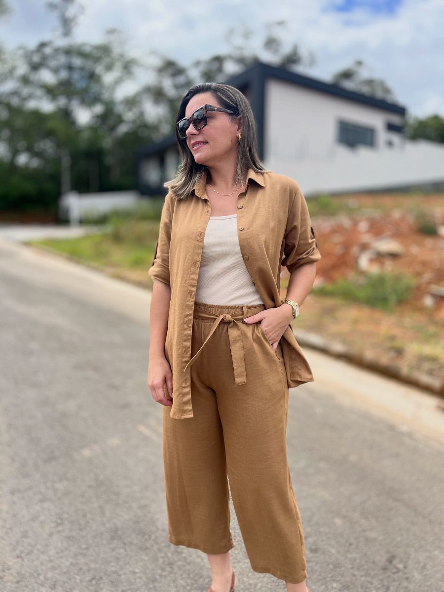 A calça pantacourt de linho é uma peça atemporal que une sofisticação e frescor, caracterizada pelo comprimento midi (entre joelho e canela) e modelagem soltinha. Confeccionada com linho, oferece conforto térmico, cós alto com elástico posterior, bolsos funcionais e caimento estruturado, ideal para looks casuais ou elegantes.