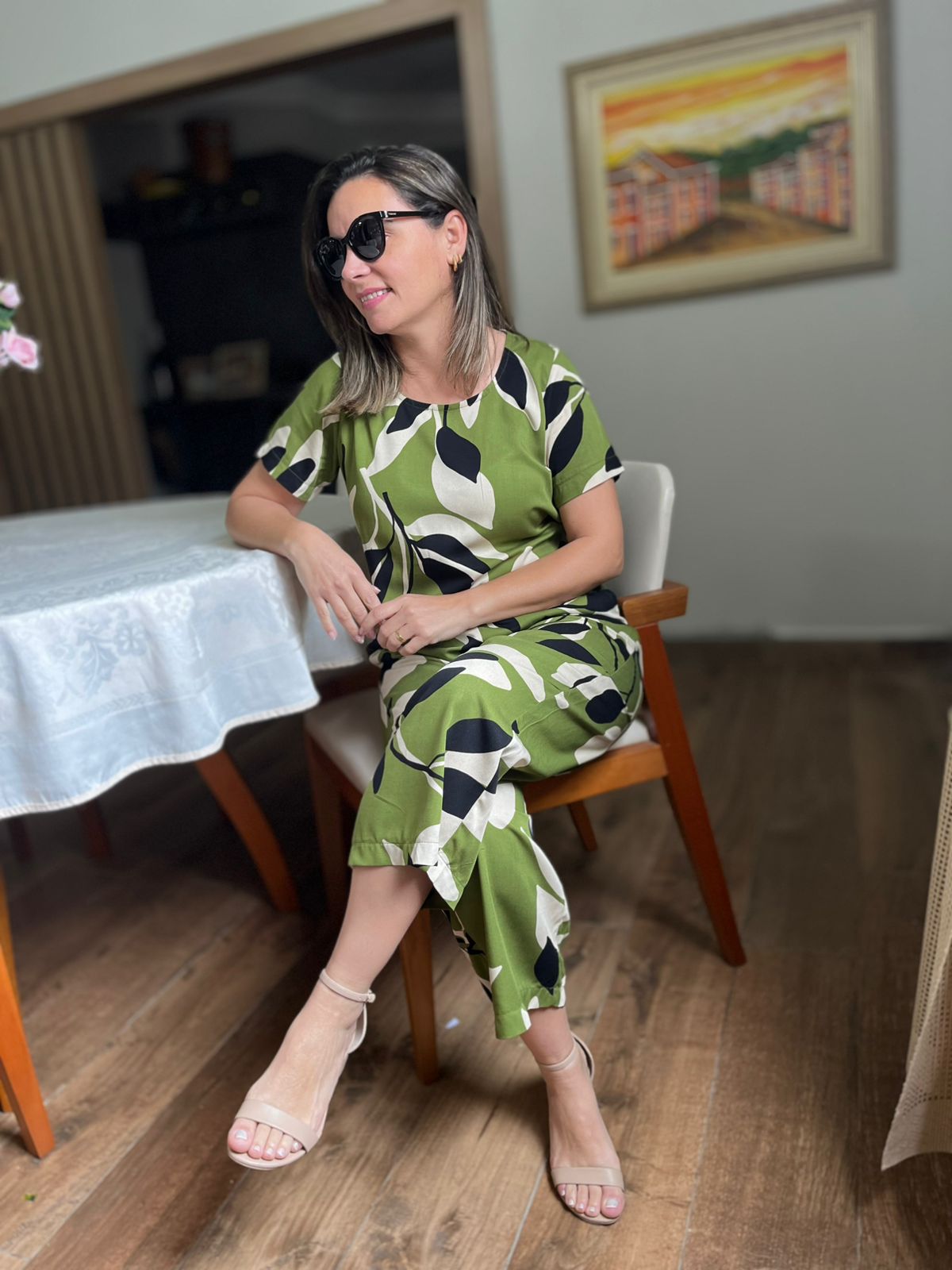 - Caimento Fluido: O tecido tem textura suave e movimento, conferindo sofisticação à peça.
