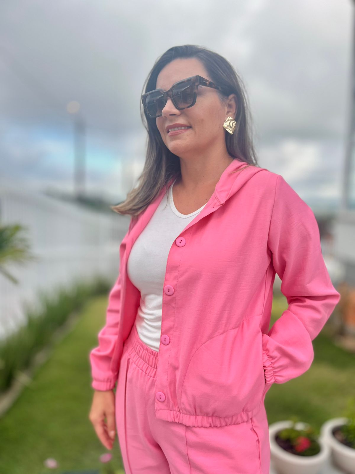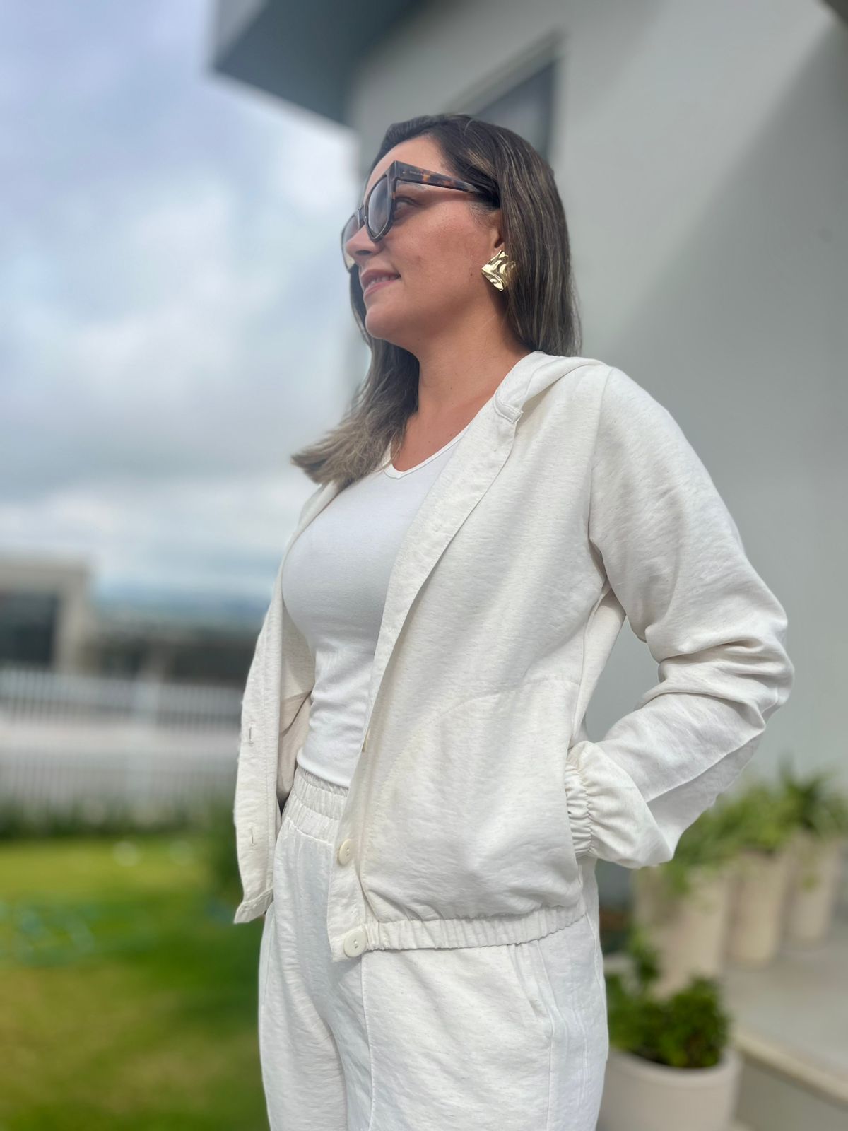 Design Híbrido: Ela une o shapeclássico da jaqueta bomber (modelagem mais solta, punhos e barra ajustados por elástico, e fechamento por zíper frontal) com a elegância de um tecido de alfaiataria, criando um visual moderno e versátil que pode ser tanto descolado quanto chique.