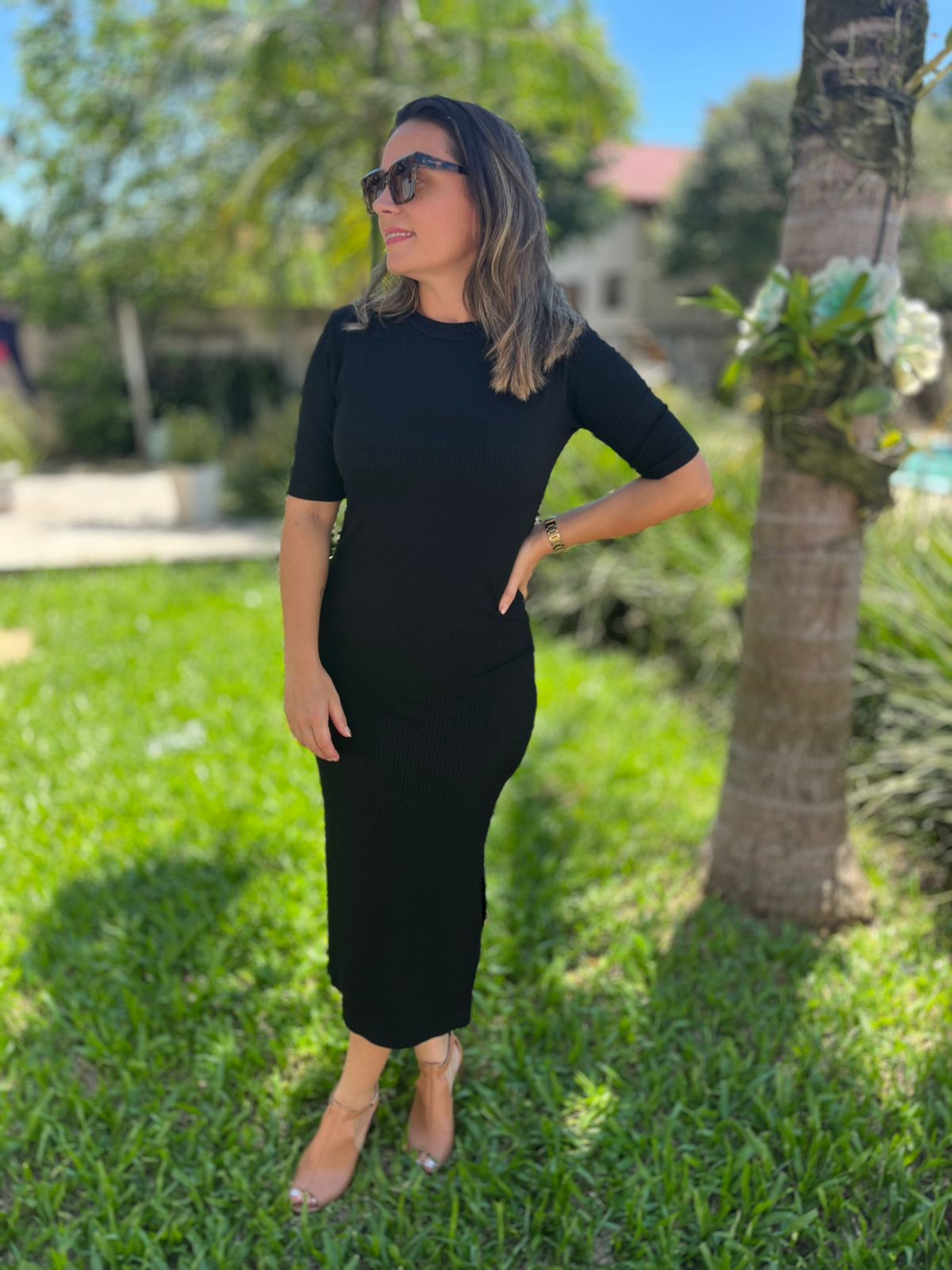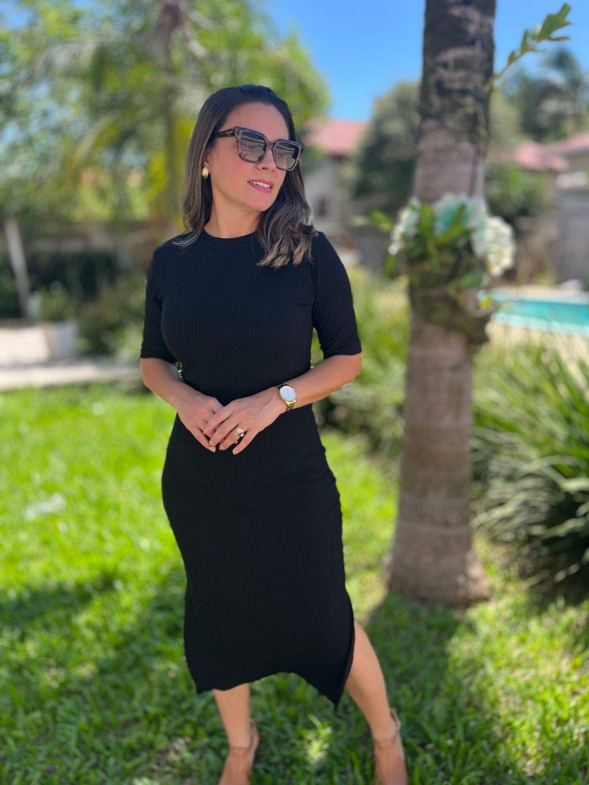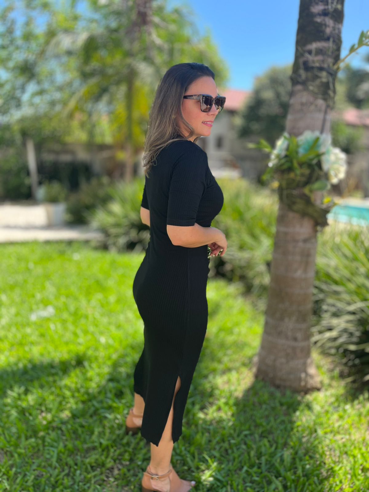 Vestido Canelado Midi mg 3/4 Gola Rolê c/Fenda – REF 115
